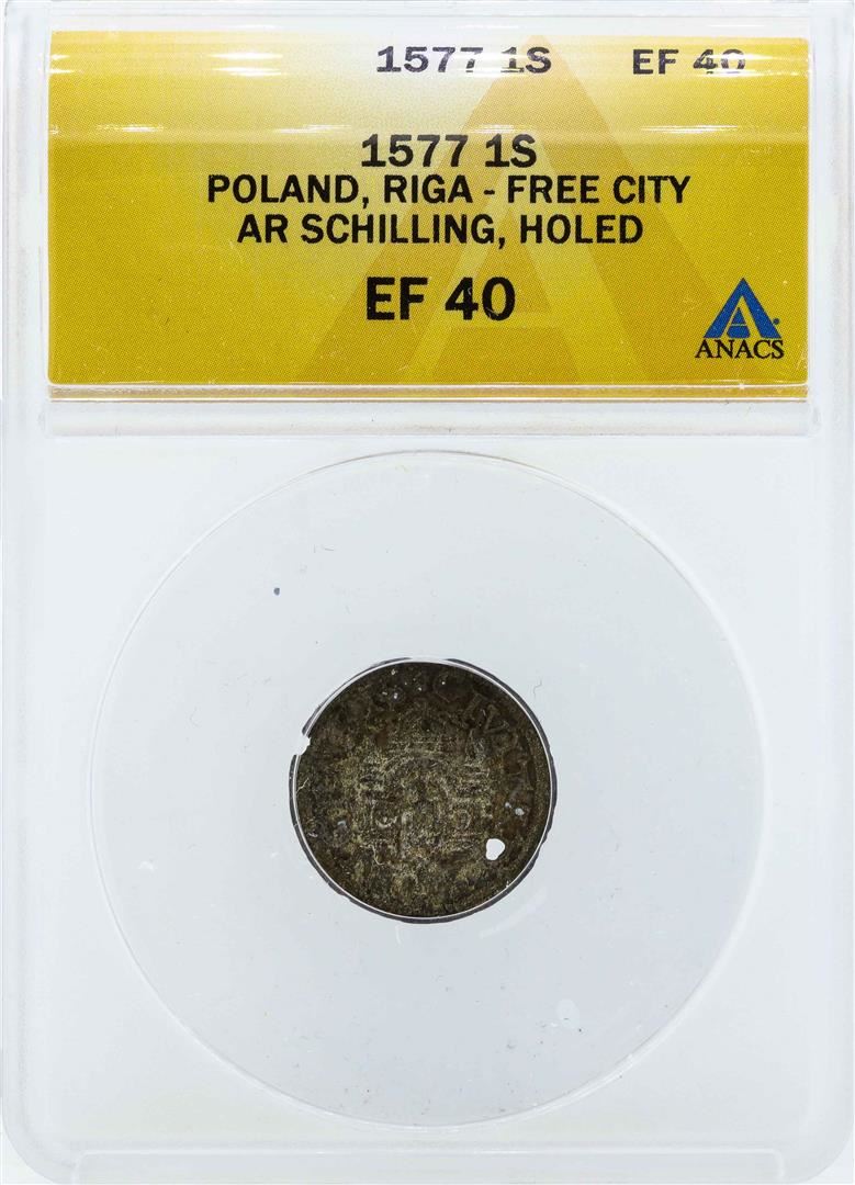 One 1577 Poland Schilling Coin ANACS EF40. ANACS Certified.
