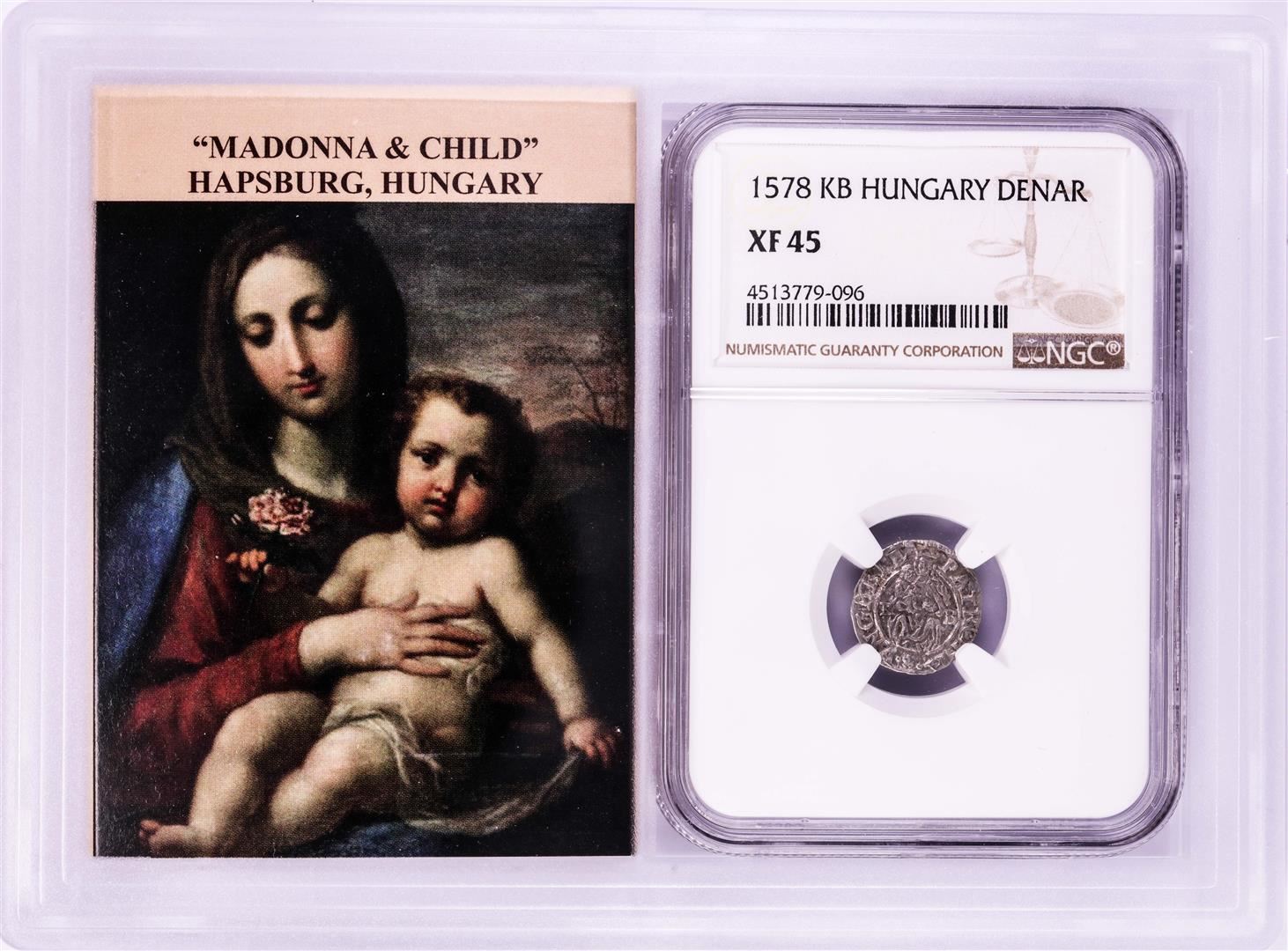 One 1578 KB Hungary Denar 'Madonna and Child' Coin NGC XF45 w/ Story Box. NGC Certified.