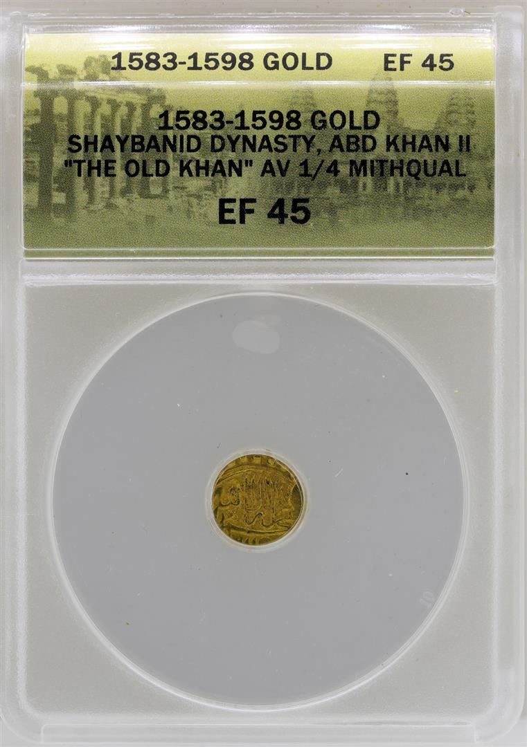 One 1583-1598 Shaybanid Dynasty ABD Khan II 1/4 Mithqual Gold Coin ANACS EF45. ANACS Certified.