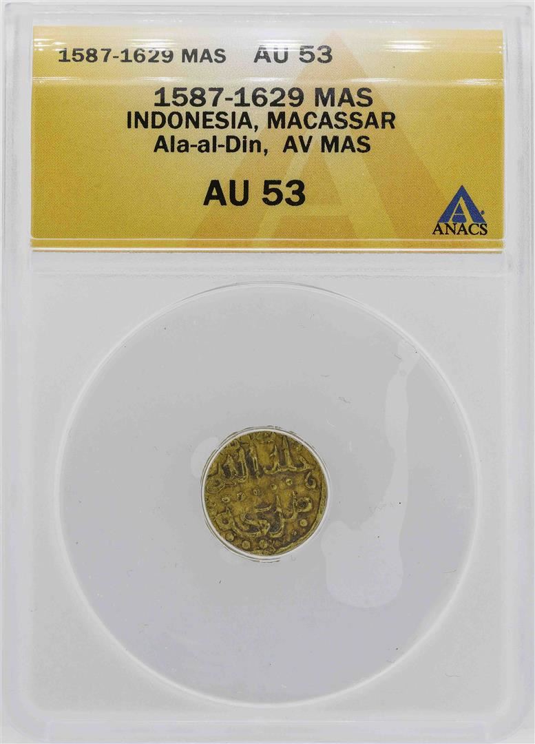 One 1587-1629 Indonisia Ala-al-Din Mas Gold Coin ANACS AU53. ANACS Certified.