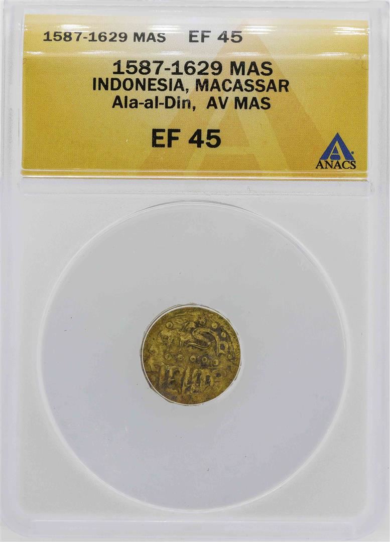 One 1587-1629 Indonisia Ala-al-Din Mas Gold Coin ANACS XF45. ANACS Certified.