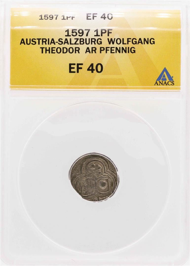 One 1597 Austria-Salzburg Wolfgang Theodor AR Pfenning Coin ANACS XF40. ANACS Certified.