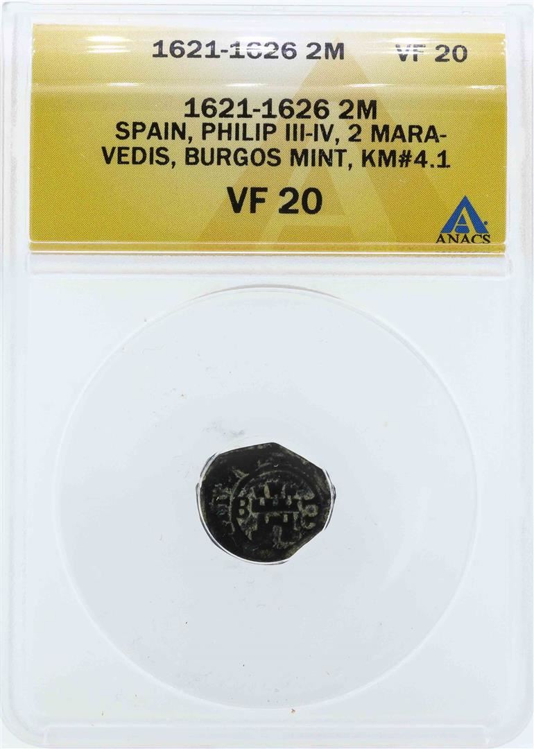 One 1621-1626 Spain Philip III-IV 2 Maravedis Coin ANACS VF20. ANACS Certified.