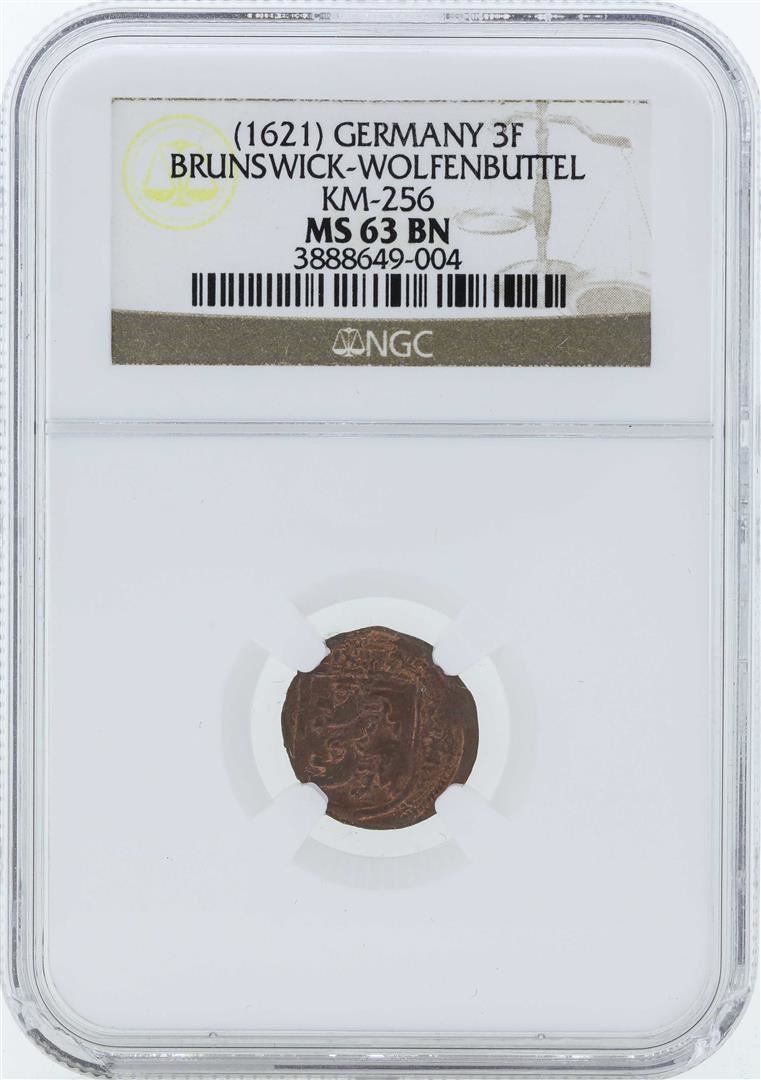 One 1621 Germany 3F Brunswick-Wolfenbuttel KM-256 Coin NGC MS63BN. NGC Certified.