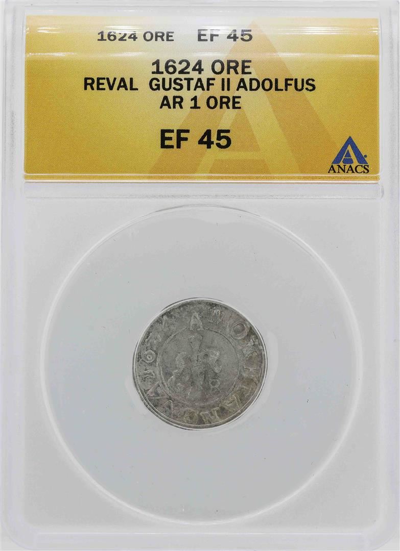 One 1624 Revel Ore Gustaf II Adolfus Coin ANACS XF45. ANACS Certified.