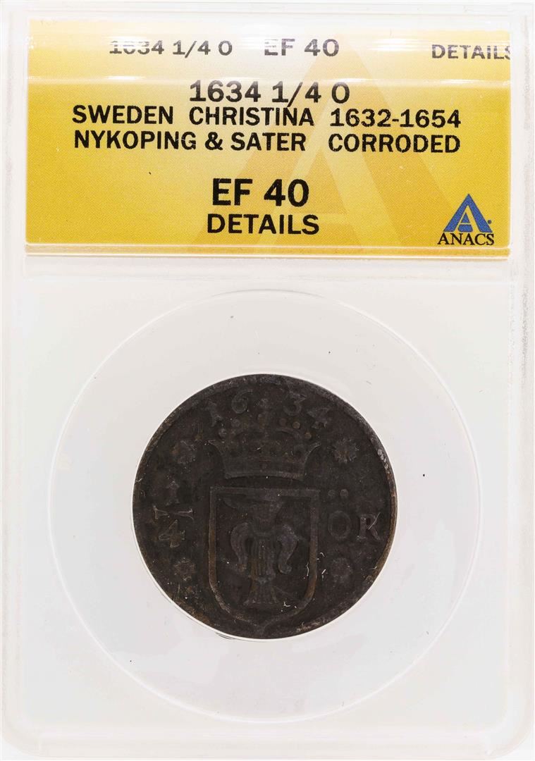 One 1634 Sweden Christina Nykoping & Sater 1/4 Ore Coin ANACS XF40 Details . ANACS Certified.