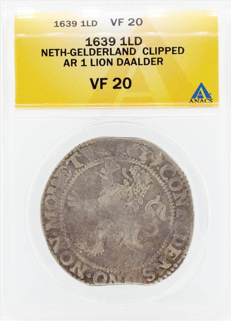 One 1639 Neth Gelderland Clipped AR 1 Lion Daalder VF20. ANACS Certified.