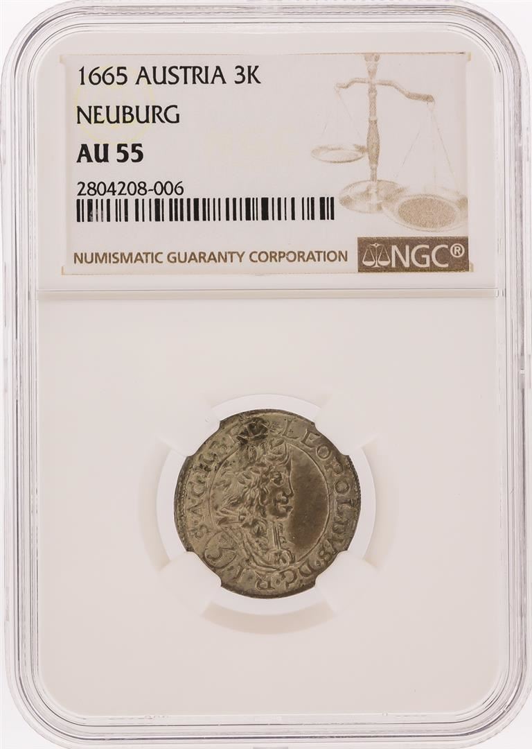 One 1665 Austria 3K Neuburg Coin NGC Graded AU55. NGC Certified.