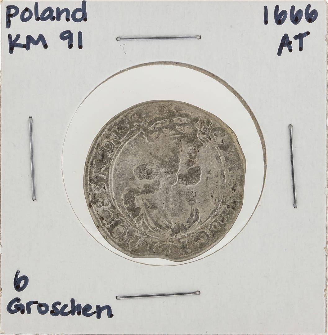 One 1666 AT Poland 6 Groschen KM91 Silver Coin.