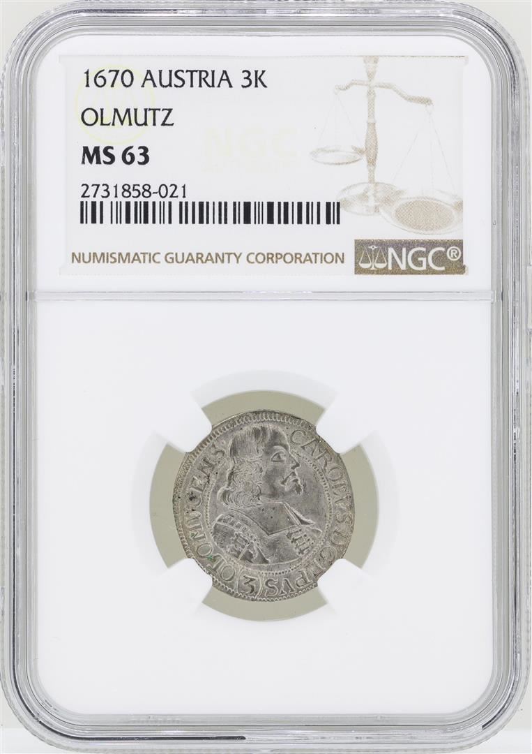 One 1670 Austria 3 Kreuzer Olmutz Coin NGC MS63. NGC Certified.