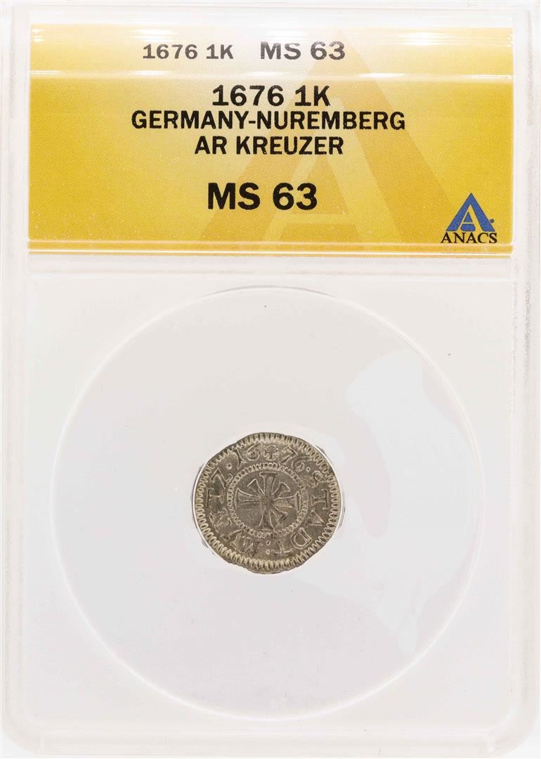 One 1676 Germany-Nuremberg AR Kreuzer Coin ANACS MS63. ANACS Certified.