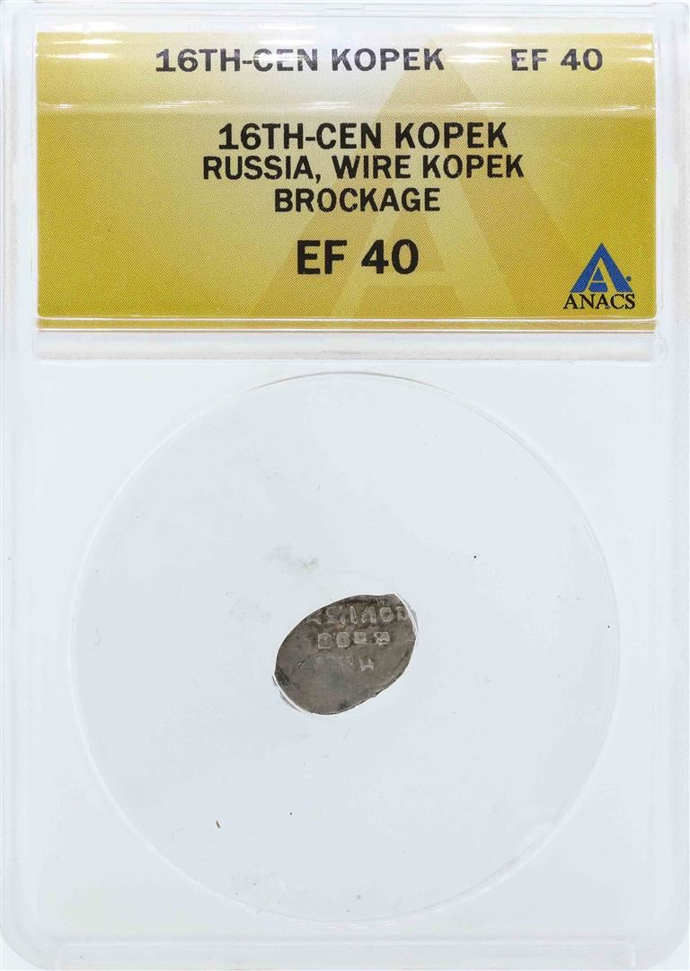 One 16th Century Russia Wire Kopek Brockage Coin ANACS EF40. ANACS Certified.