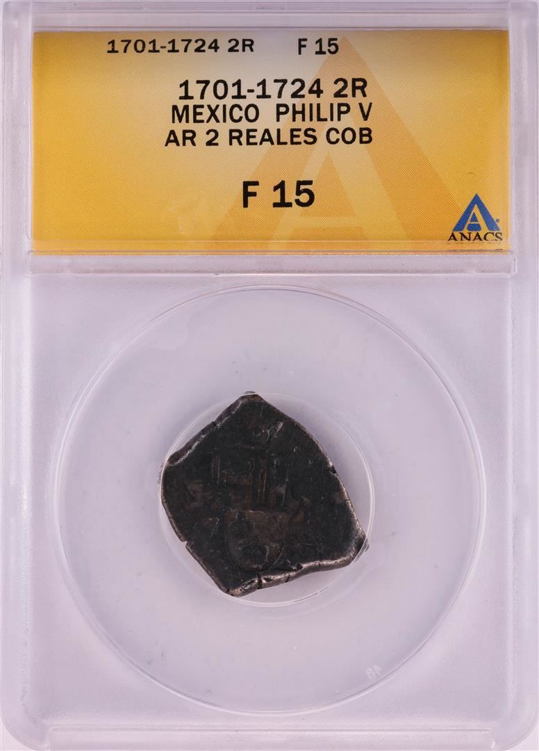 One 1701-1724 Mexico Philip V 2 Reales Cob Coin ANACS F15. ANACS Certified.