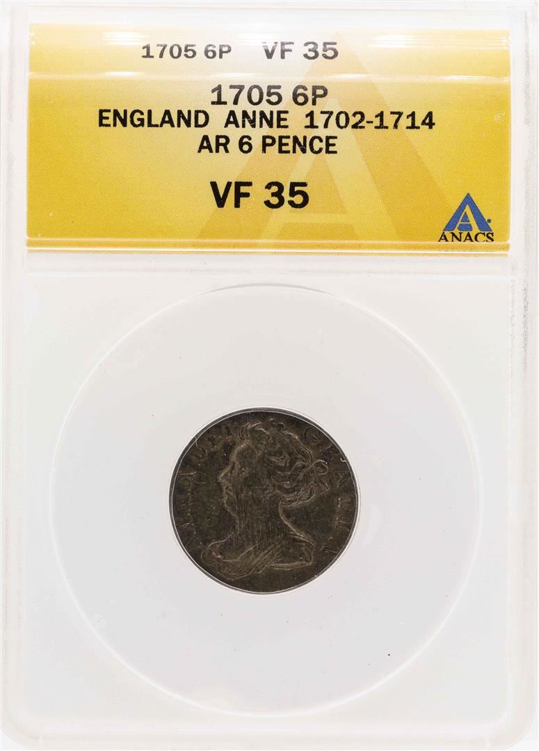 One 1705 England Anne AR 6 Pence ANACS VF35. ANACS Certified.