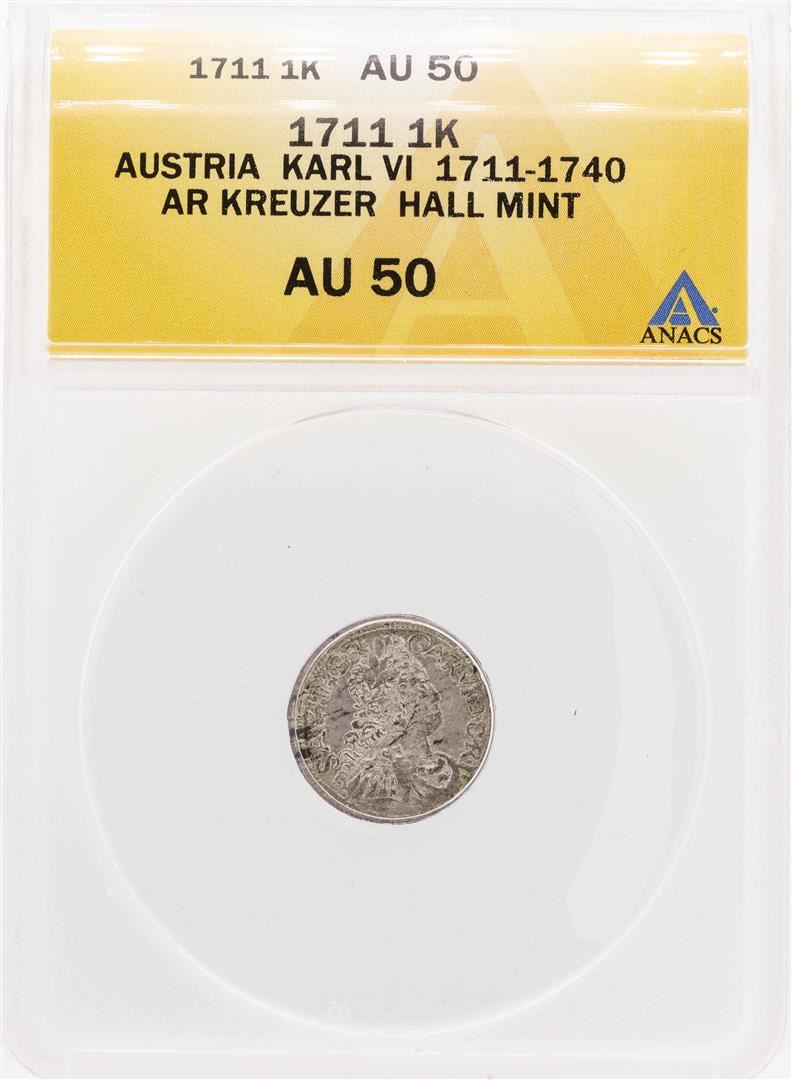 One 1711 Austria Karl AR Kreuzer Hall Mint Coin ANACS AU50. ANACS Certified.