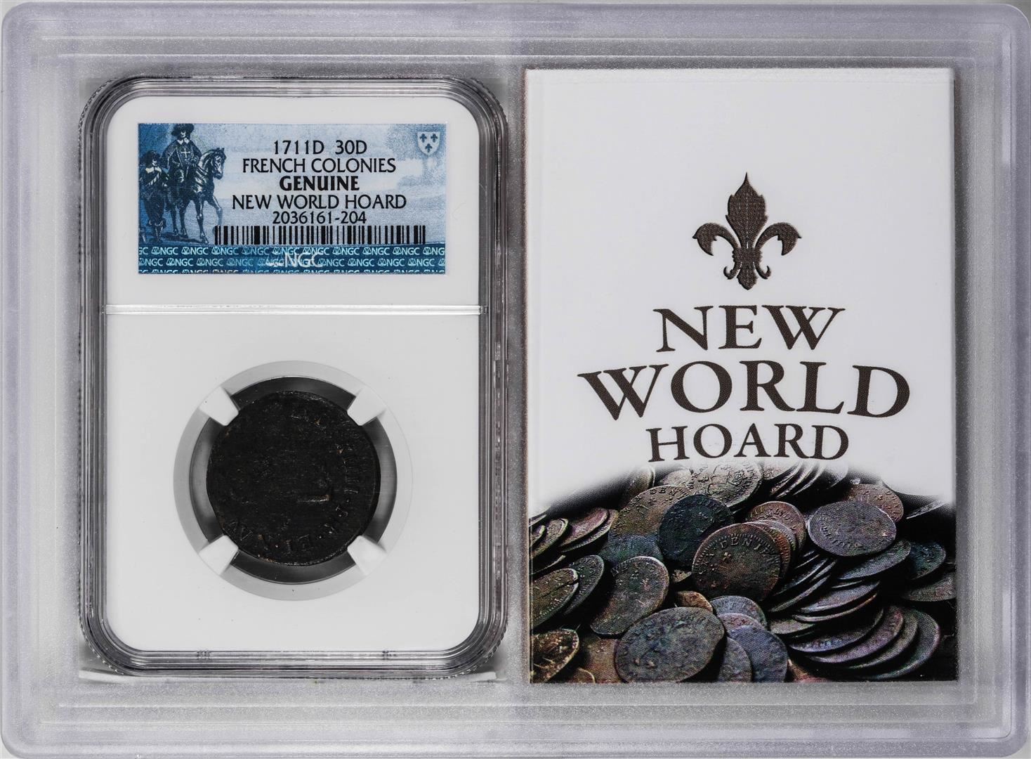 One 1711-D French Colonies 30 Denar New World Hoard NGC Genuine with Story Box. NGC Certified.