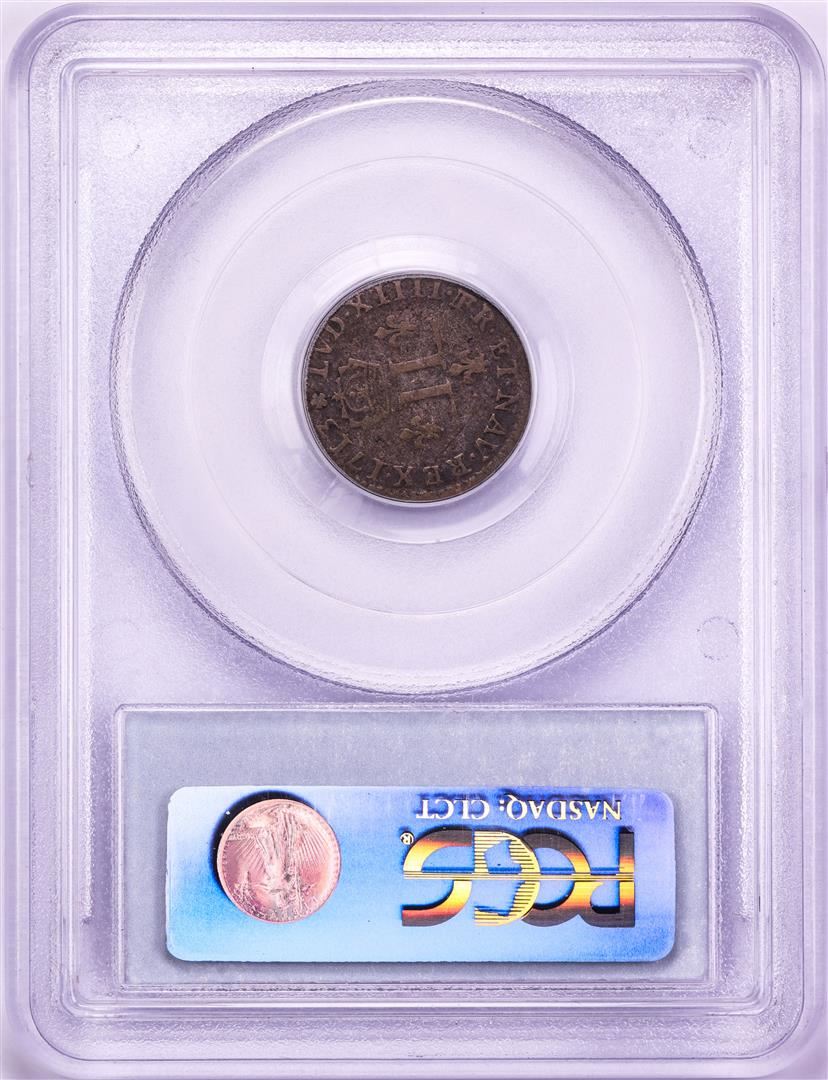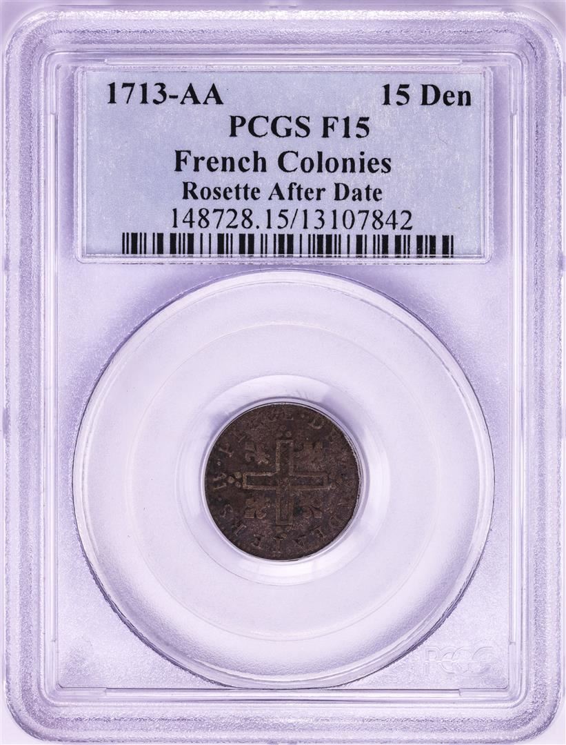 One 1713-AA French Colonies 15 Deniers Rosette After Date Coin PCGS F15. PCGS Graded.