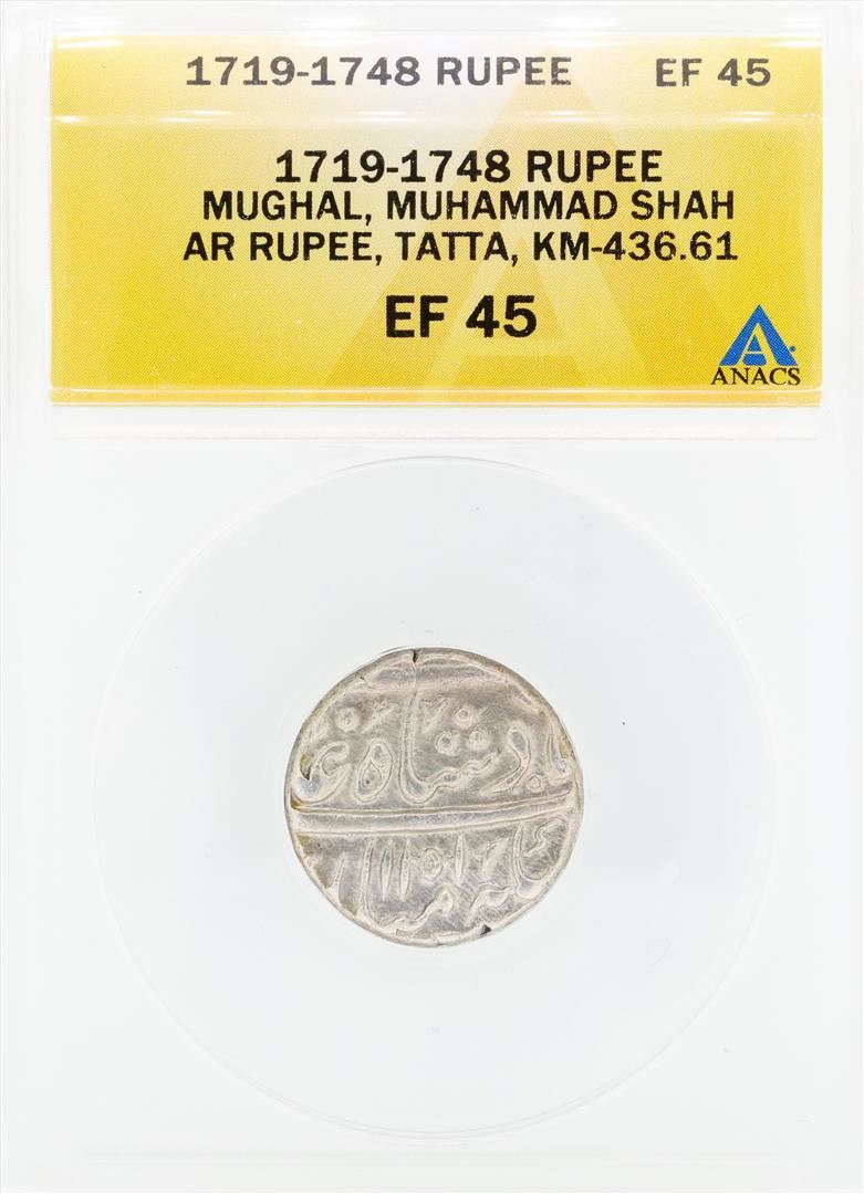 One 1719-1748 Rupee Mughal Muhammad Shah AR Tatta Coin ANACS EF45. ANACS Certified.