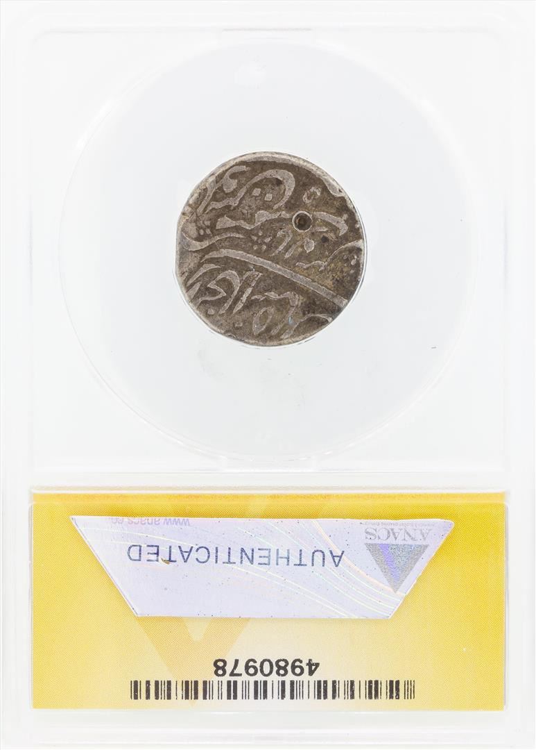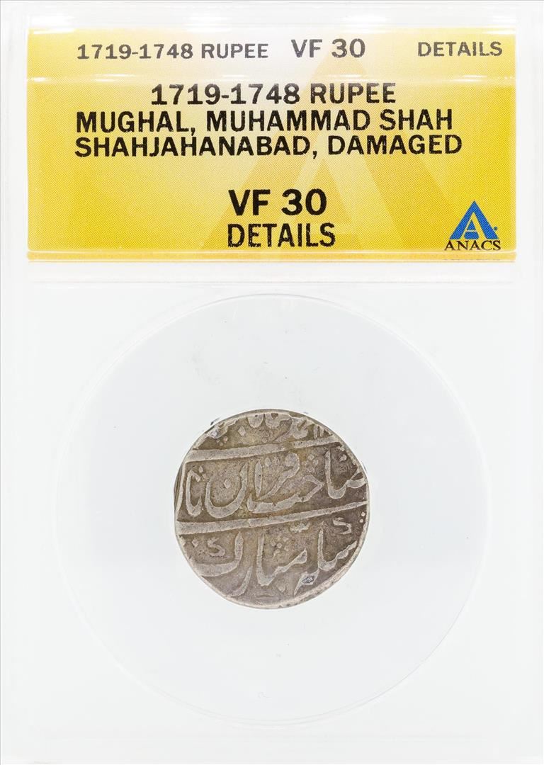 One 1719-1748 Rupee Mughal Muhammad Shah Shahjahanabad Damaged Coin ANACS VF30 Details. ANACS Certified.