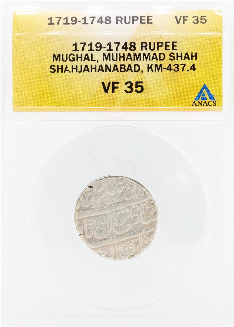 One 1719-1748 Rupee Mughal Muhammad Shah Shahjahanabad KM-437.4 Coin ANACS VF35. ANACS Certified.