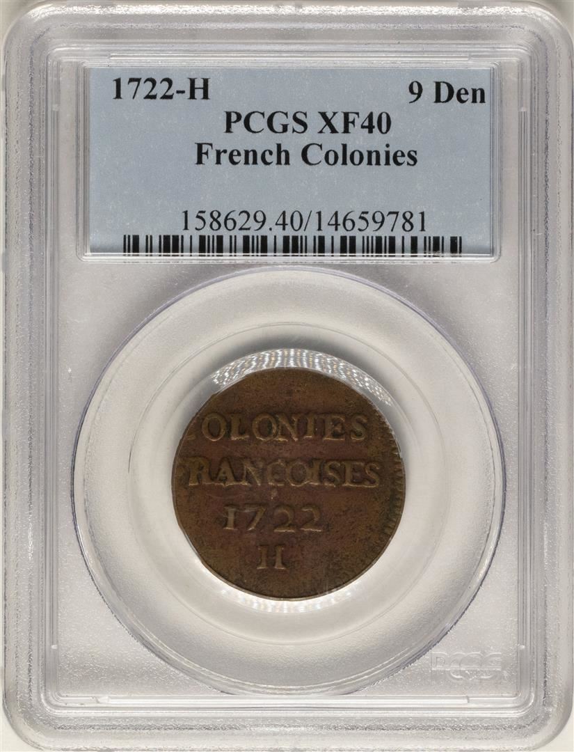 One 1722-H French Colonies 9 Deniers Colonial Coin PCGS XF40. PCGS Graded.
