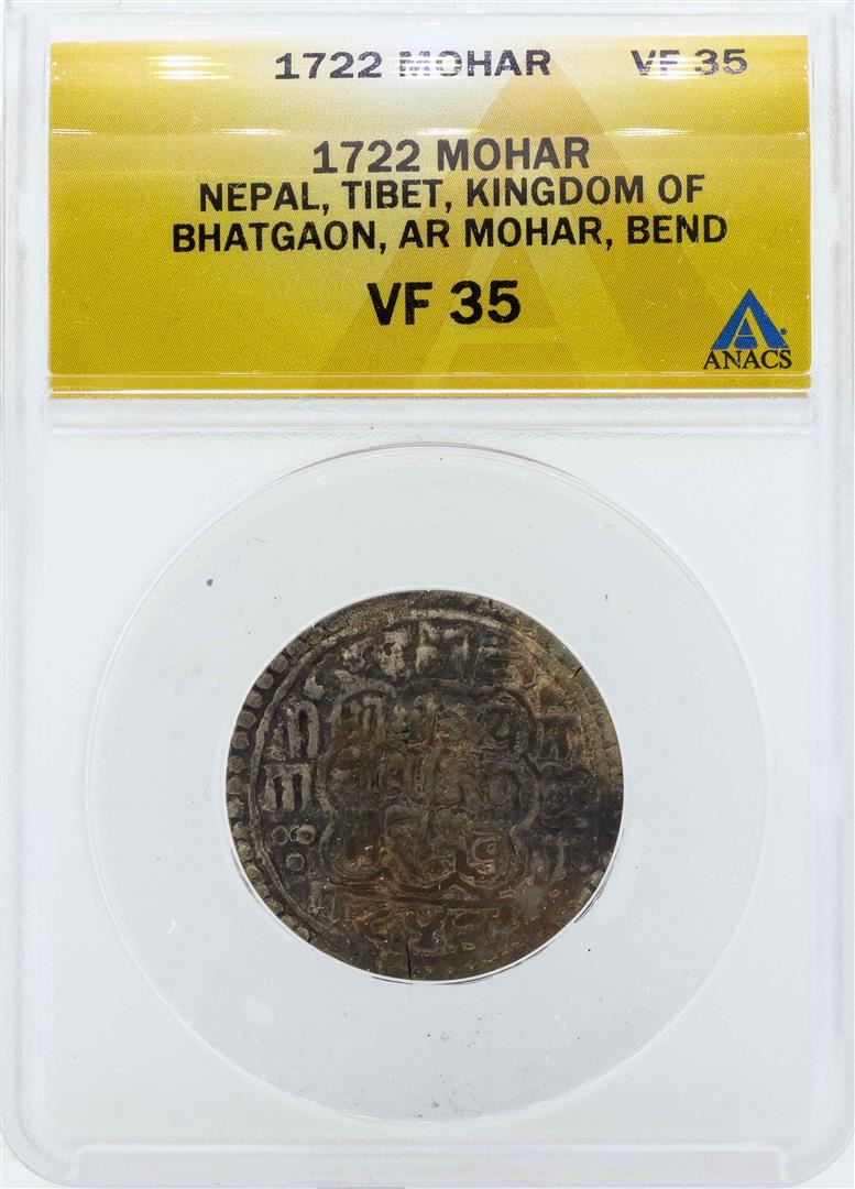 One 1722 Nepal Mohar Tibet Kingdom of Bhatgaon Coin ANACS VF35. ANACS Certified.