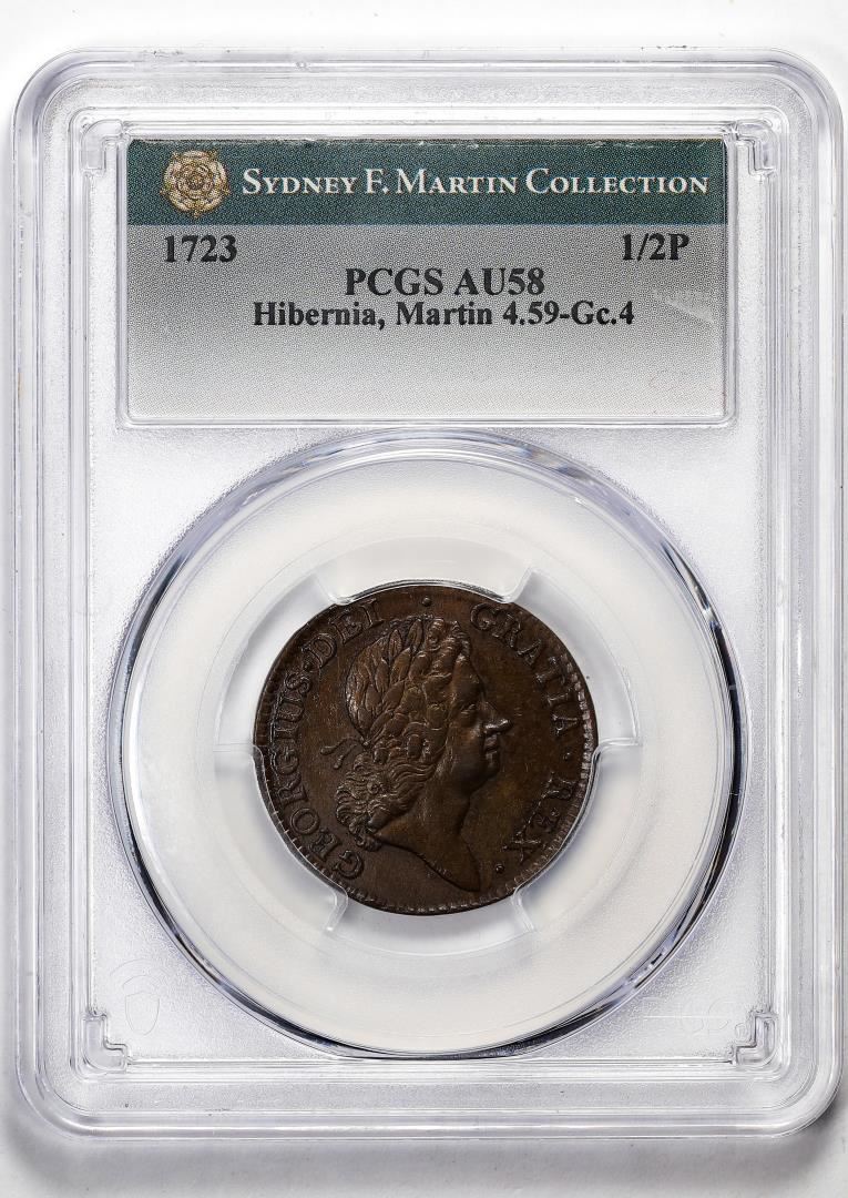 1723 Half Penny Hibernia, Martin Colonial Copper Coin Sydney F. Martin Col. PCGS AU58