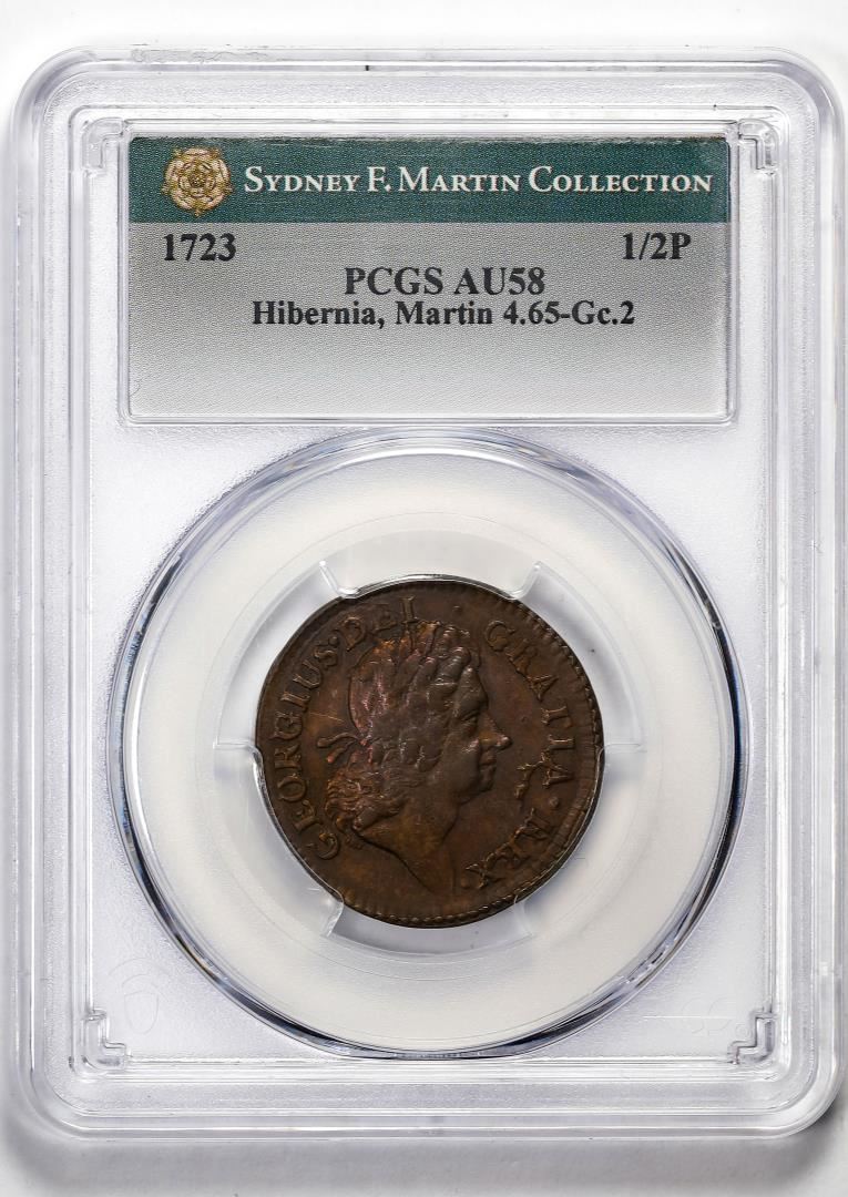 1723 Half Penny Hibernia, Martin Colonial Copper Coin Sydney F. Martin Col. PCGS AU58