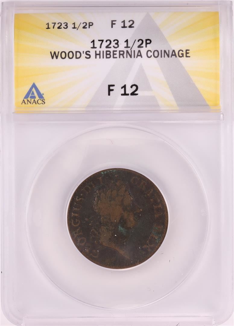 One 1723 Half Penny Wood's Hibernia Colonial Copper Coin ANACS F12. ANACS Certified.