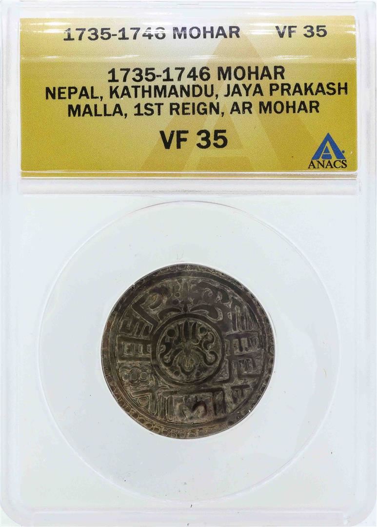One 1735-1746 Mohar Nepal Coin ANACS VF35. ANACS Certified.