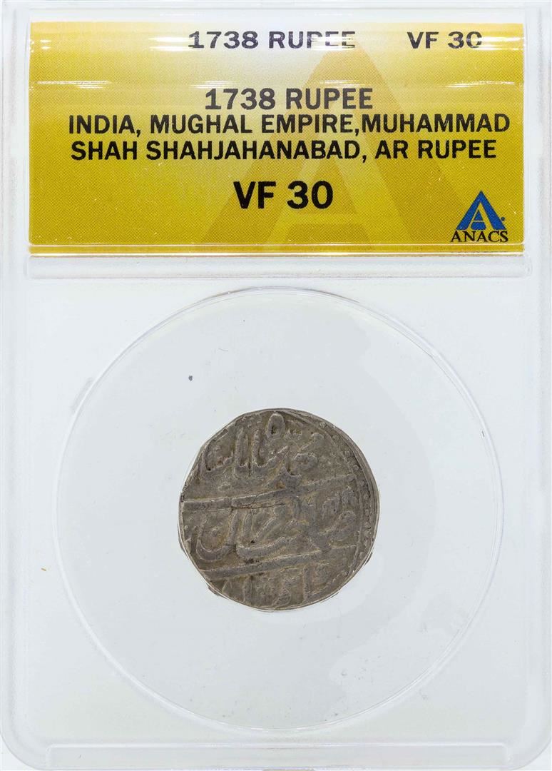One 1738 India Rupee Mughal Empire Coin ANACS VF30. ANACS Certified.