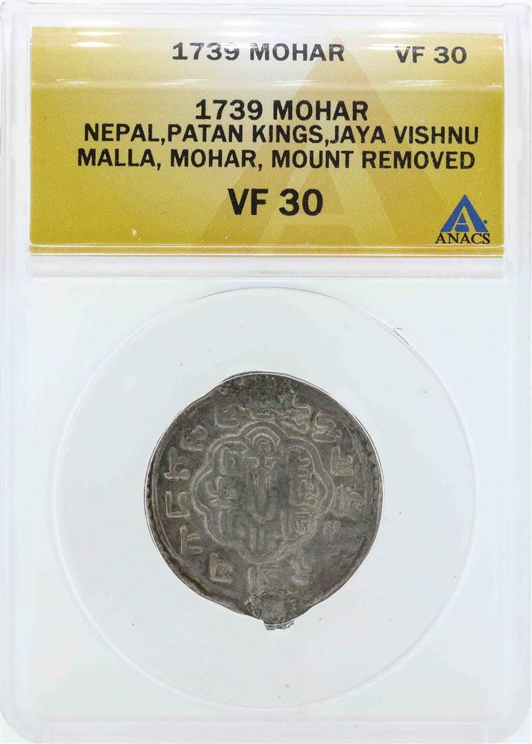 One 1739 Nepal Patan Kings Mohar Coin ANACS VF30. ANACS Certified.
