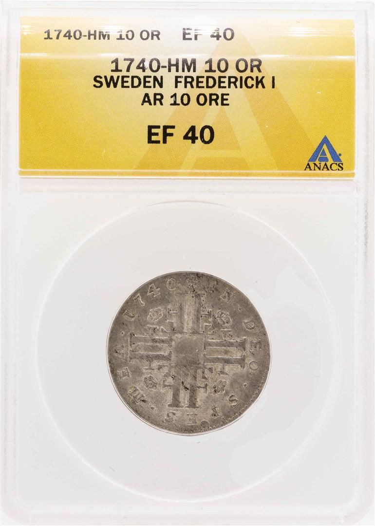 One 1740-HM Sweden Frederick I AR 10 Ore Coin ANACS XF40. ANACS Certified.
