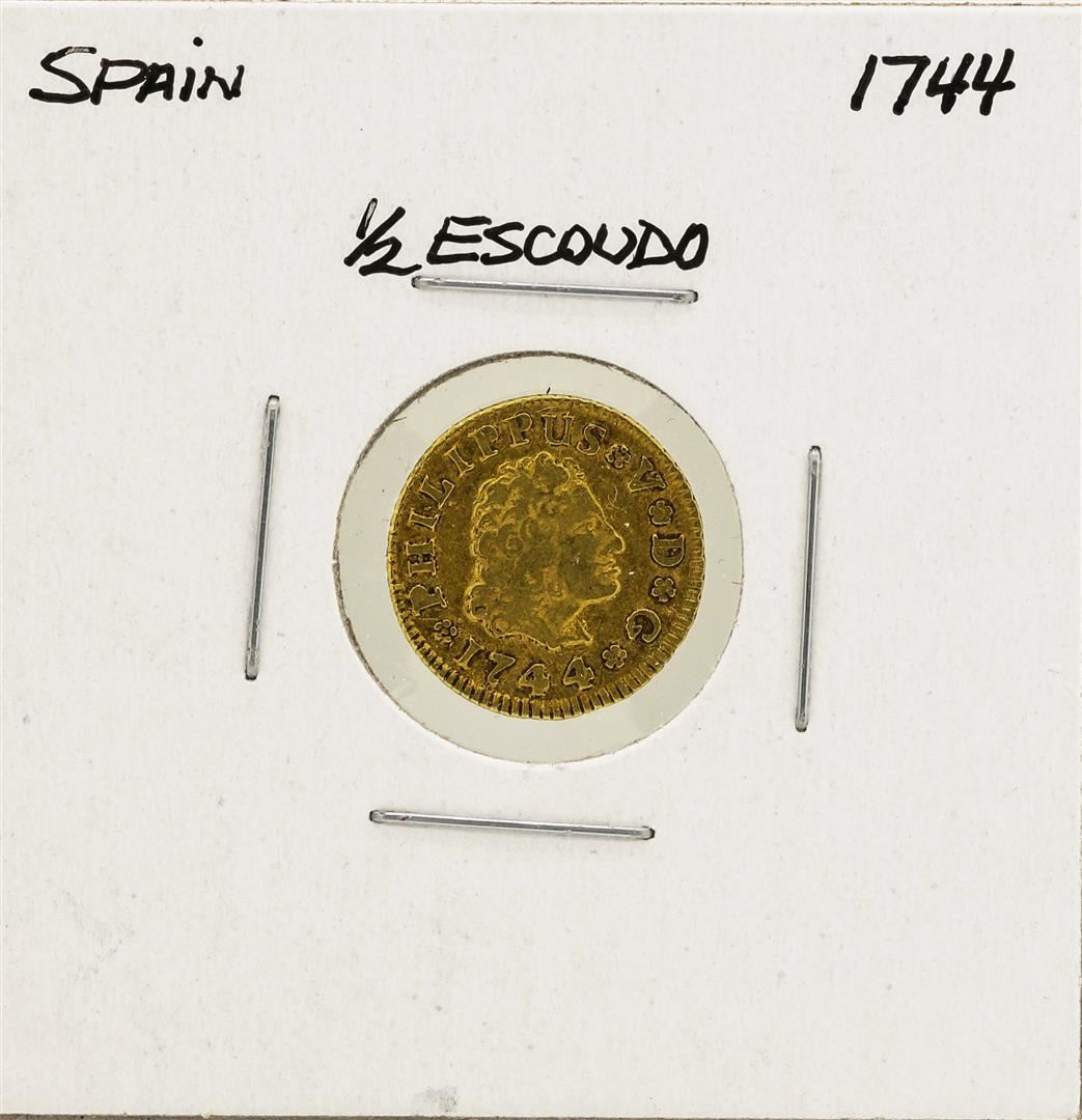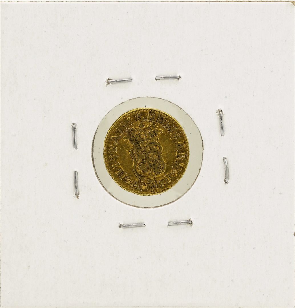 One 1744 Felipe V Spanish 1/2 Escudos Gold Coin.