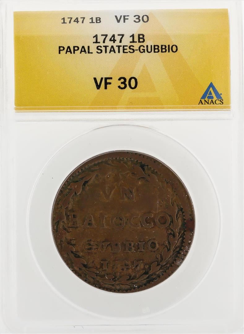 One 1747 1 Biaocco Papal States Gubbio Coin ANACS VF30. ANACS Certified.