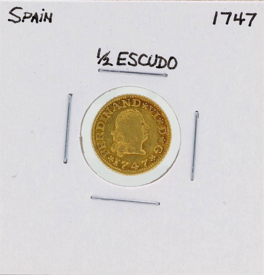 One 1747 Ferdinand VI Spanish 1/2 Escudos Gold Coin.