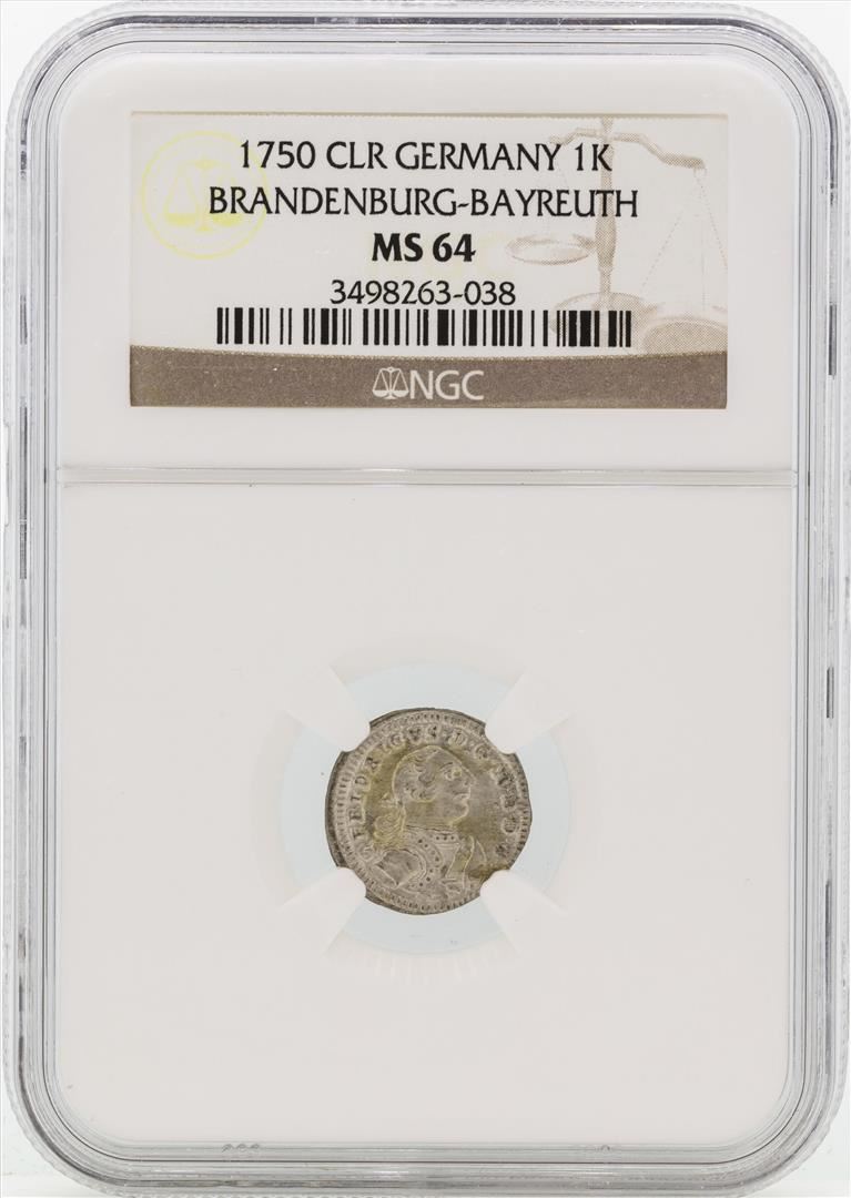 One 1750 Germany Bradenburg-Bayreuth 1 Kreutzer Coin NGC MS64. NGC Certified.