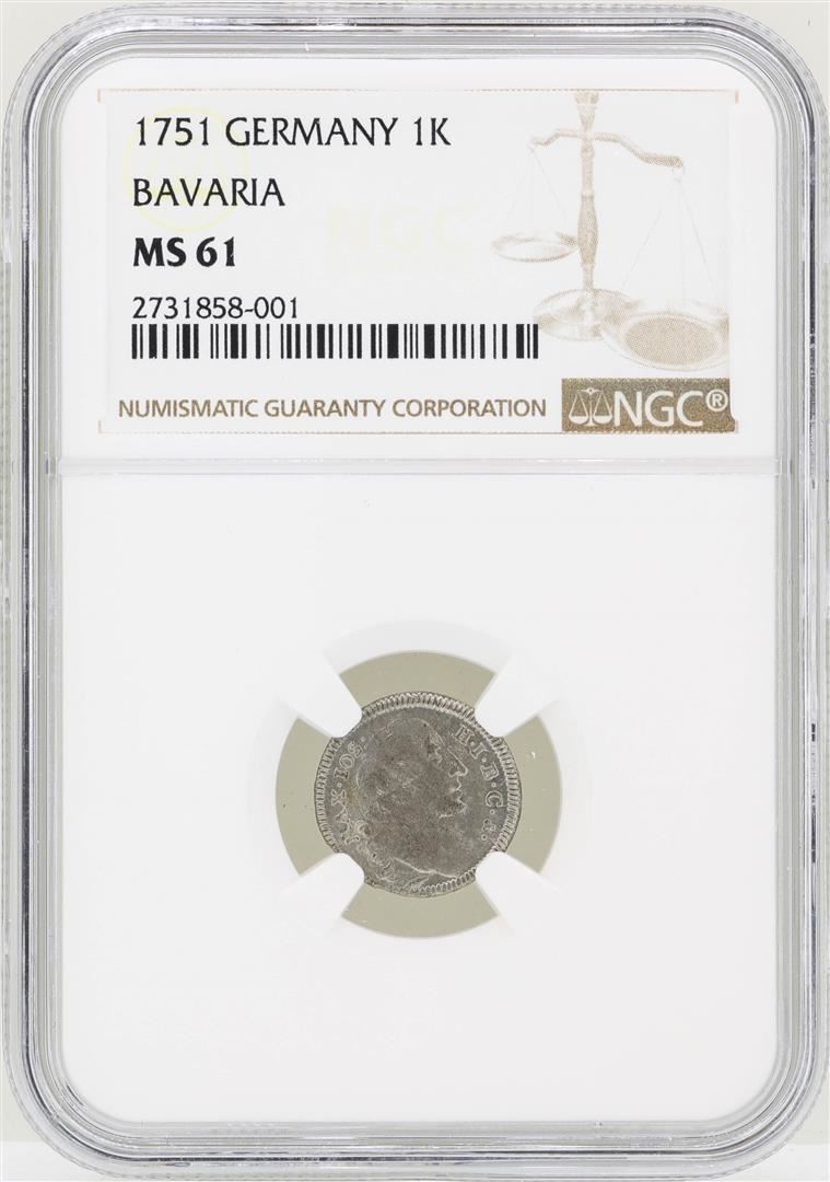 One 1751 Germany Kreuzer Bavaria Coin NGC MS61. NGC Certified.
