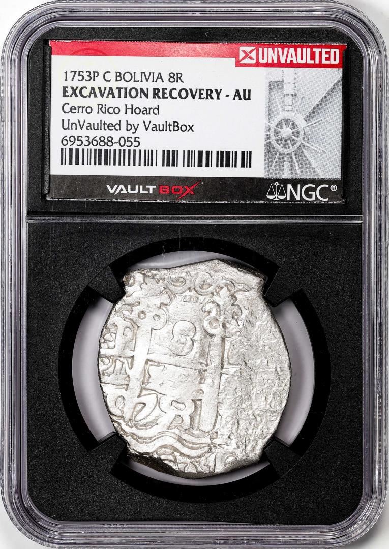 1753P C Bolivia 8 Reales Silver Coin NGC Excavation Recovery AU VaultBox Unvaulted