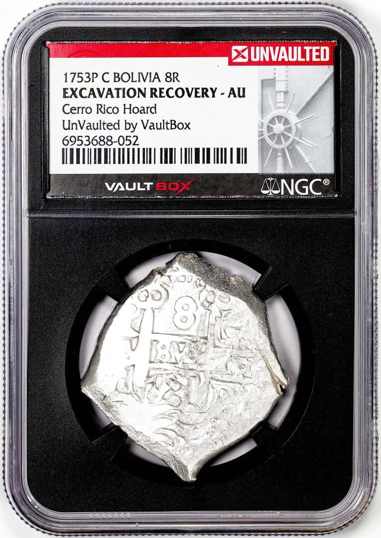 1753P C Bolivia 8 Reales Silver Coin NGC Excavation Recovery AU VaultBox Unvaulted