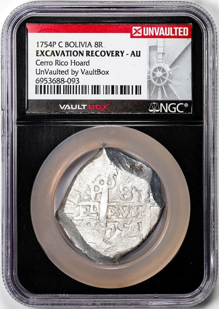 1754P C Bolivia 8 Reales Silver Coin NGC Excavation Recovery AU VaultBox Unvaulted