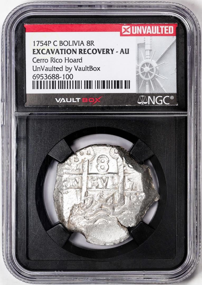 1754P C Bolivia 8 Reales Silver Coin NGC Excavation Recovery AU VaultBox Unvaulted