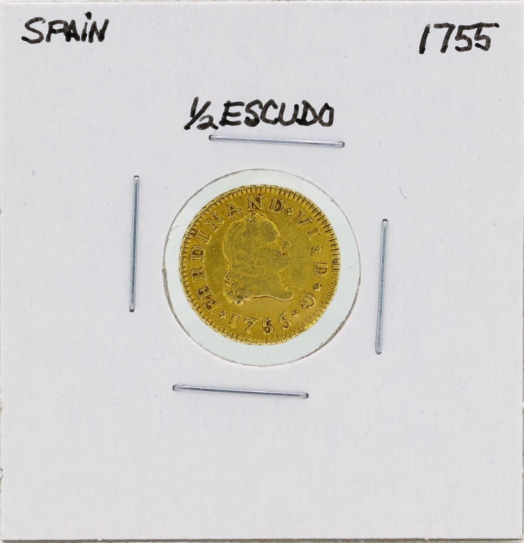One 1755 Ferdinand VI Spanish 1/2 Escudos Gold Coin.