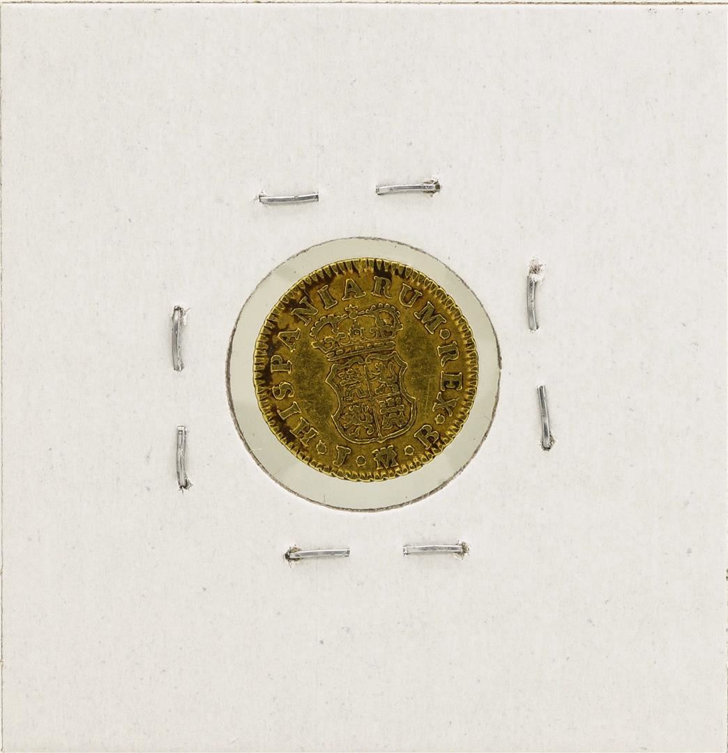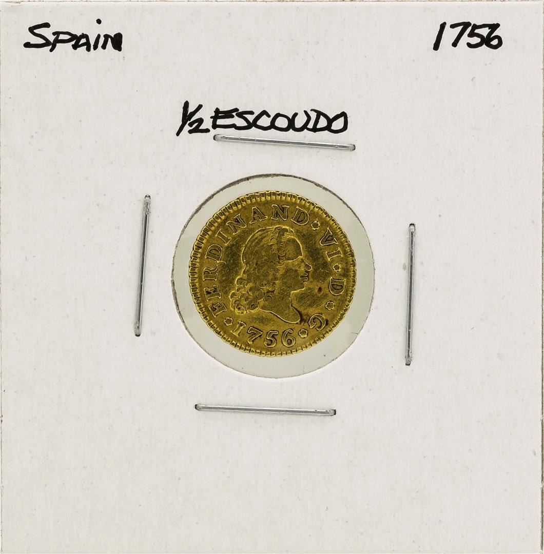 One 1756 Ferdinand VI Spanish 1/2 Escudos Gold Coin.