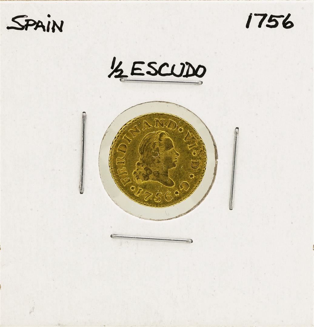 One 1756 Ferdinand VI Spanish 1/2 Escudos Gold Coin.