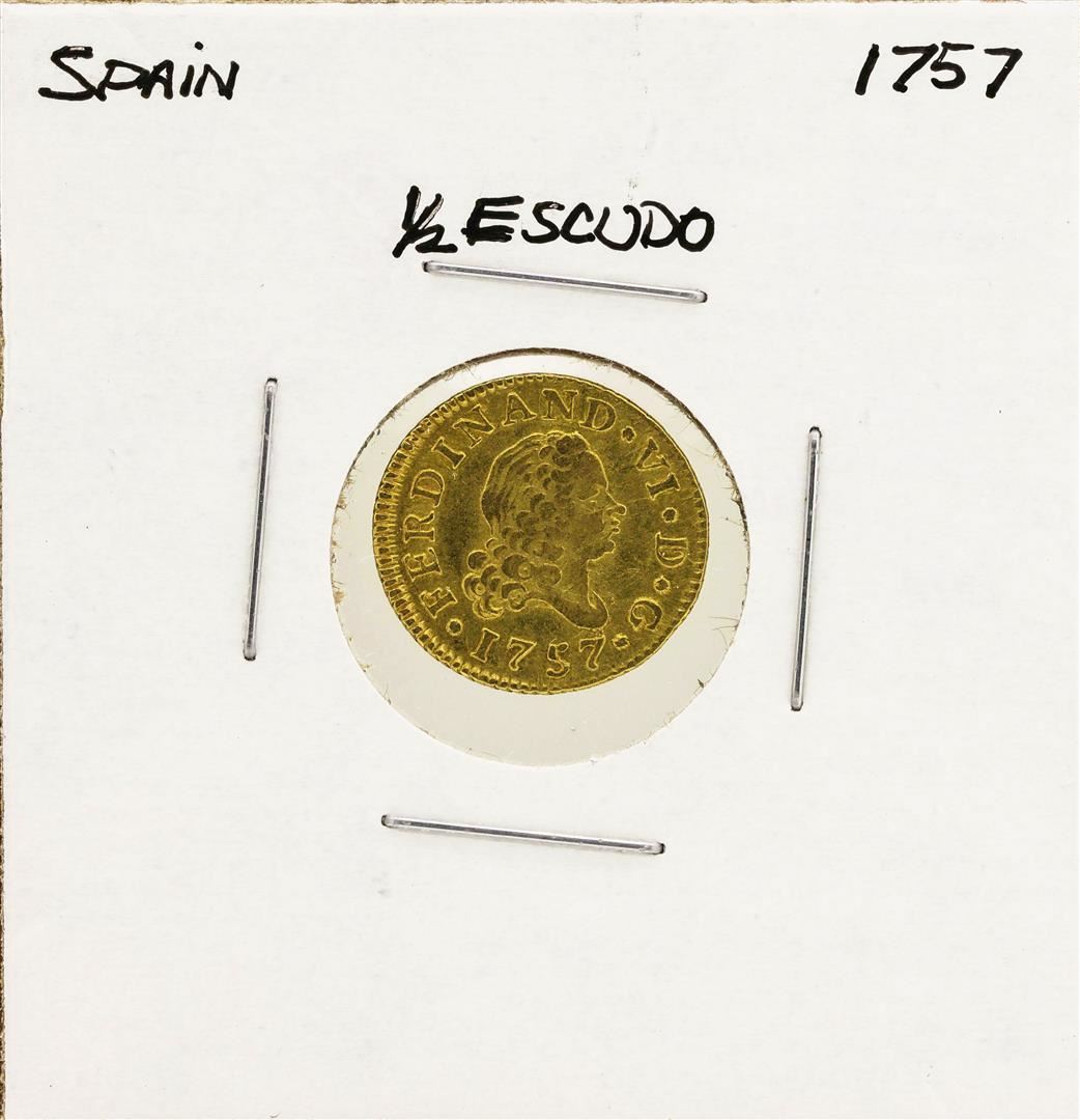 One 1757 Ferdinand VI Spanish 1/2 Escudos Gold Coin.