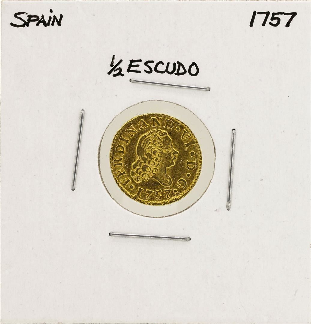 One 1757 Ferdinand VI Spanish 1/2 Escudos Gold Coin.