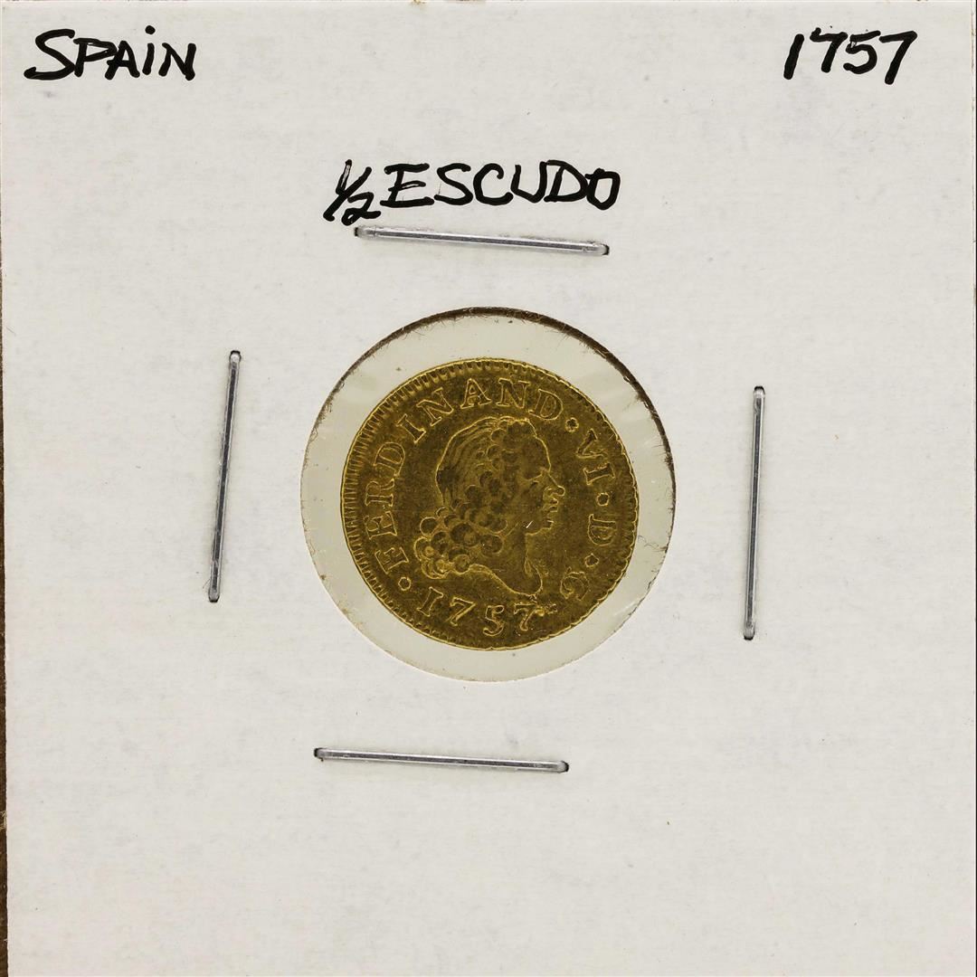 One 1757 Ferdinand VI Spanish 1/2 Escudos Gold Coin.