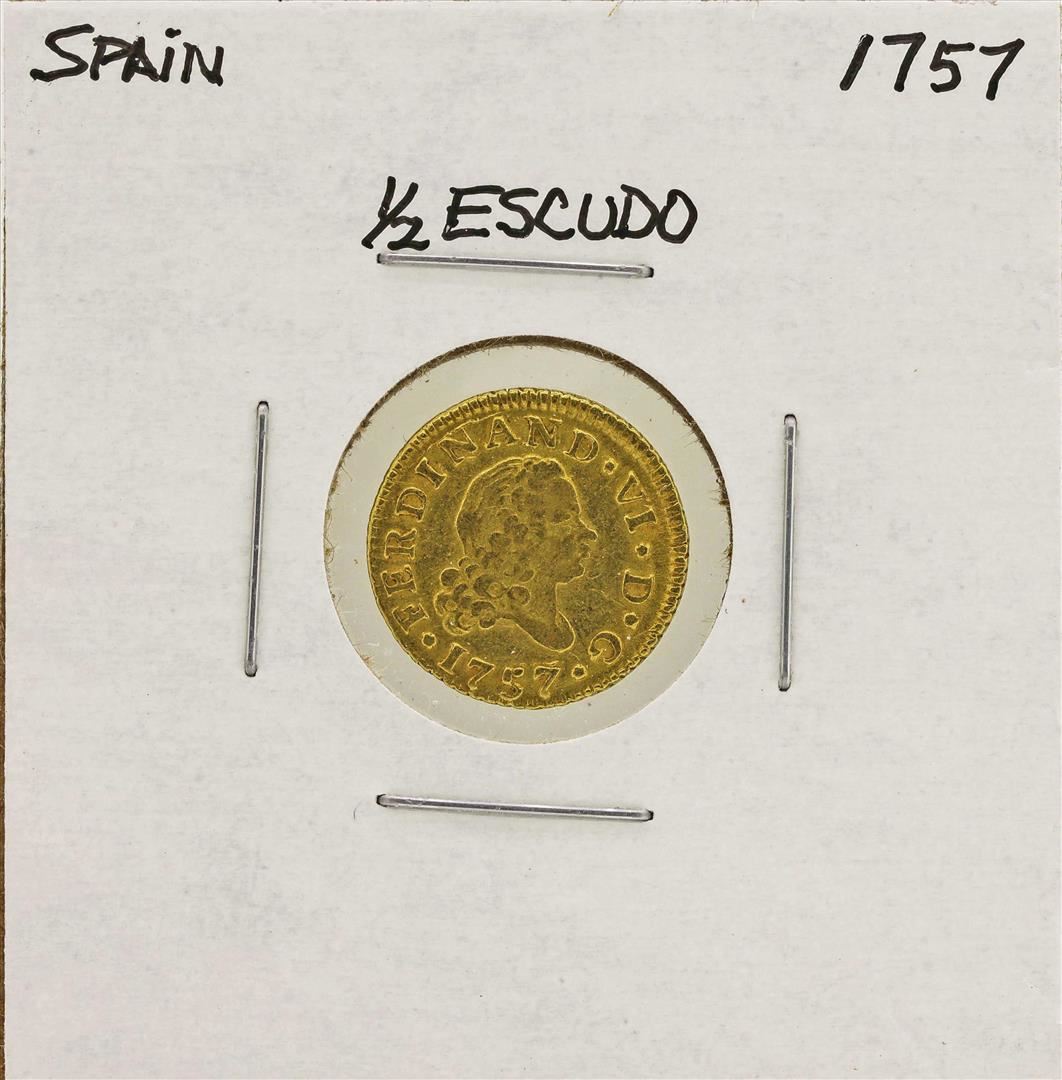 One 1757 Ferdinand VI Spanish 1/2 Escudos Gold Coin.