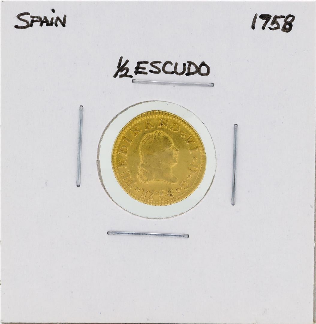 One 1758 Ferdinand VI Spanish 1/2 Escudos Gold Coin.